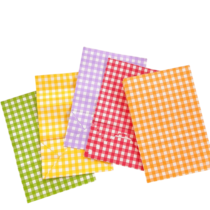 Kolorowe torby papierowe kraft z wzorem w kratkę to idealne rozwiązanie do stylowego i ekologicznego pakowania drobnych prezentów, słodyczy lub ciastków. Wykonane są z wytrzymałego, recyklingowalnego papieru, który jest odporny, przyjemny w dotyku i przyjazny dla środowiska. Dzięki wymiarom 23 x 15 x 8 cm oferują wystarczająco dużo miejsca na prezenty, przekąski i różne drobiazgi. Te torby to doskonały wybór na śluby, przyjęcia urodzinowe, festiwale, imprezy lub jako praktyczny organizer na mniejsze przedmioty.