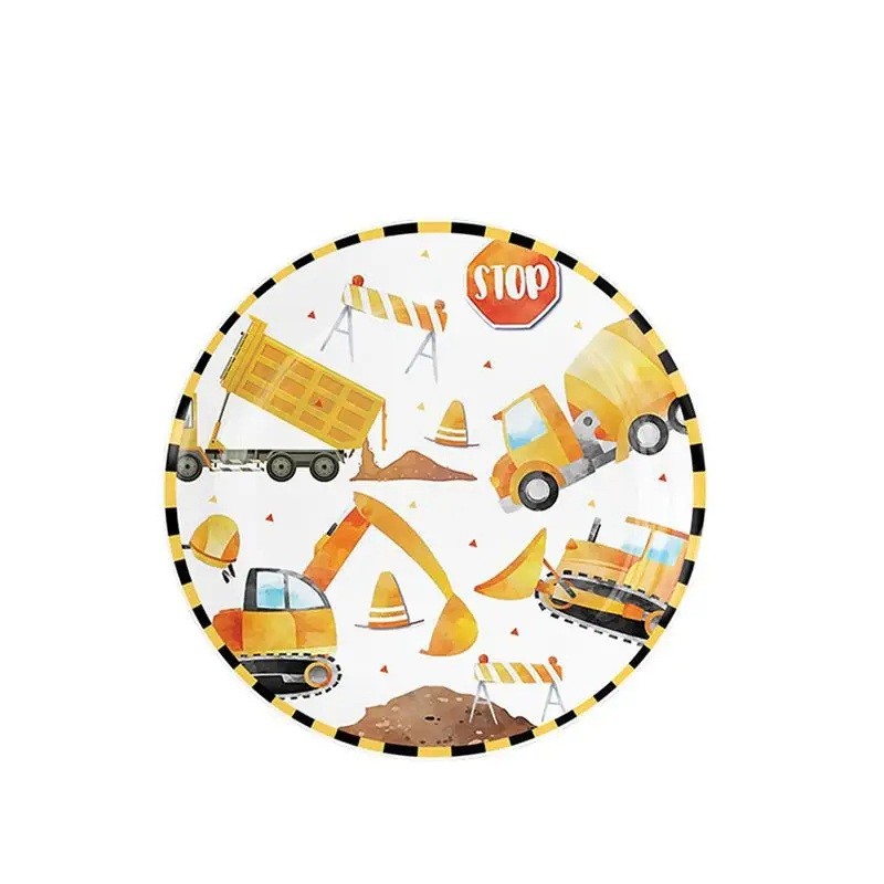 10 sztuk Papierowych talerzy 18 cm Pojazdy budowlane Koparka Betoniarka Pasiasty brzeg Jednorazowe talerzyki na dziecięcą imprezę urodzinową