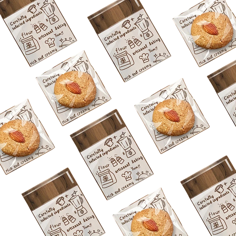 100 sztuk Samouzawierające się plastikowe woreczki 10 x 13 cm Przezroczyste opakowania na ciastka, cukierki i przekąski Białe woreczki z motywami pieczenia i gotowania Świąteczne, Halloweenowe, imprezowe opakowanie