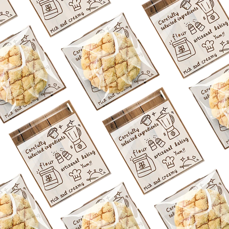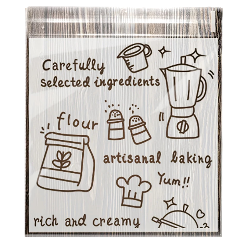 100 sztuk Samouzawierających się torby plastikowe 14 x 17 cm Przezroczyste opakowania na ciastka, cukierki i smakołyki Białe torby z motywami pieczenia i gotowania Świąteczne, Halloweenowe, opakowanie prezentowe