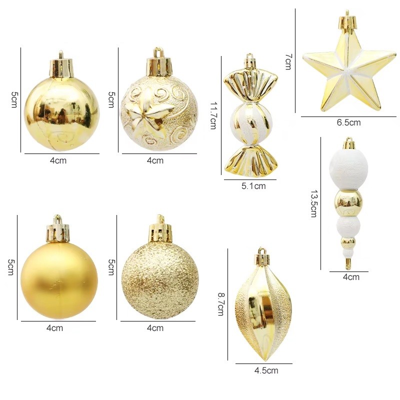 • Różne dekoracyjne kształty, takie jak kule, sopelki i gwiazdy, tworzą bogaty efekt wizualny
