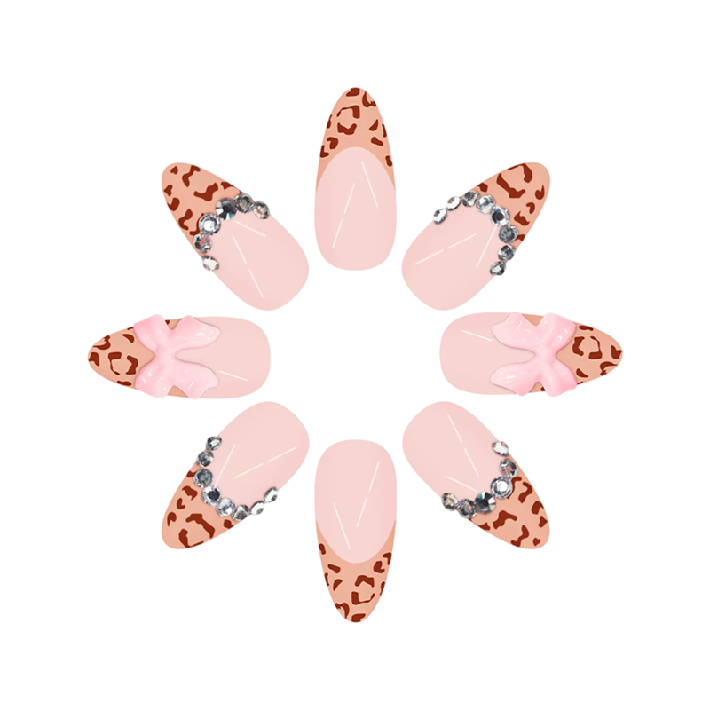 24-częściowy zestaw sztucznych paznokci w kształcie migdałowym z leopardzim wzorem, 3D kokardkami i kamieniami, różne rozmiary, klej i pilnik w zestawie