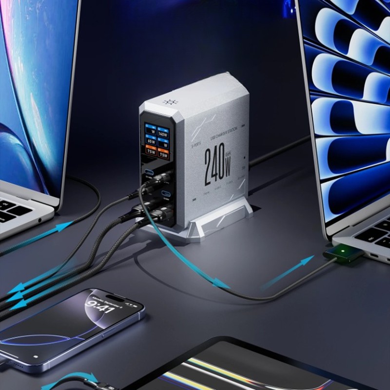 Ta stacja ładująca jest idealnym wyborem dla każdego, kto jednocześnie korzysta z wielu urządzeń i potrzebuje stabilnego oraz szybkiego zasilania. Dzięki wysokiej mocy jest w stanie zastąpić kilka osobnych ładowarek, co zmniejsza bałagan na biurku i w domu. Kompaktowa obudowa z technologią GaN zapewnia długą żywotność, wysoką efektywność oraz bezpieczną pracę nawet przy długotrwałym użytkowaniu. Jeśli szukasz uniwersalnego rozwiązania do ładowania laptopów, smartfonów, tabletów czy innych urządzeń, ta 240W GaN stacja ładująca spełni nawet najbardziej wymagające oczekiwania. Oferuje doskonałe połączenie mocy, bezpieczeństwa i praktyczności oraz stanie się centralnym punktem ładowania w Twojej przestrzeni roboczej.