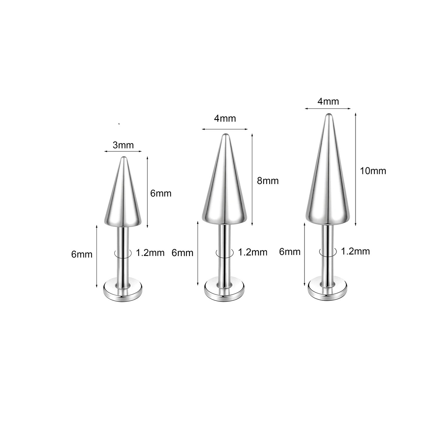 3 sztuki kolczyków stożkowych 6 mm Stal chirurgiczna Kształt stożkowy Wysokiej jakości biżuteria do ucha, nosa, wargi, sutka