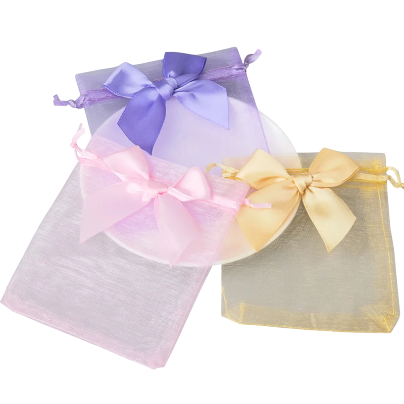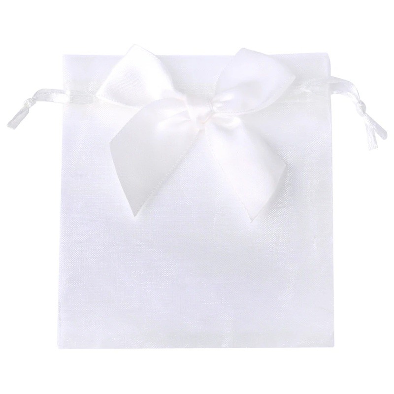 - Zawartość opakowania: 50 sztuk torebek prezentowych z organzy 9 x 12 cm ze sznurkiem ściągającym i kokardą