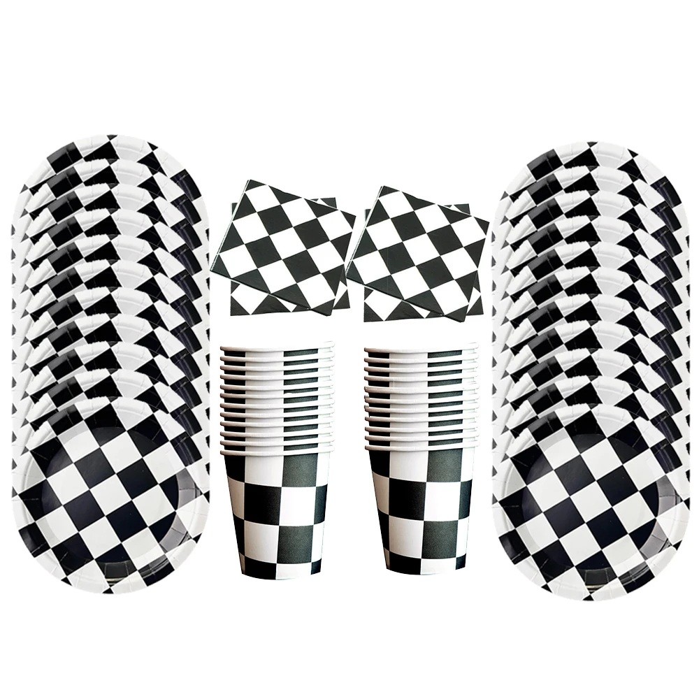 - Kompletny zestaw naczyń na przyjęcie z motywem wyścigowej szachownicy