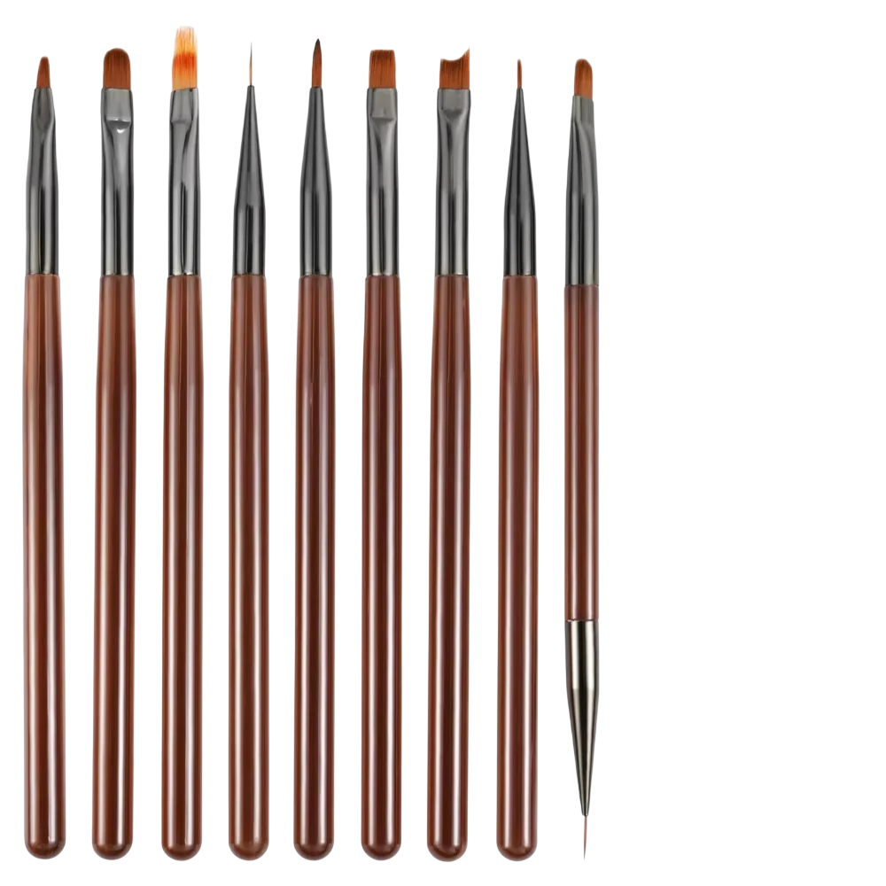 9-częściowy brązowy zestaw pędzli do paznokci 15,5 - 16 cm, 5,2 - 12,7 mm, mocne delikatne włosie Ten 9-częściowy zestaw pędzli do paznokci jest idealny dla wszystkich, którzy zajmują się manicure i nail artem. Każdy pędzel ma
