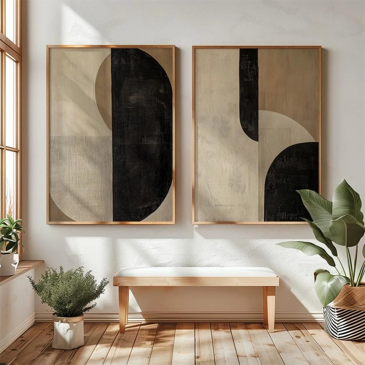 Płótno nadaje plakatom naturalną teksturę i delikatną powierzchnię, która przypomina malarstwo. Dzięki temu dekoracja nie wydaje się zbyt sztywna ani zakłócająca. Plakaty są bez ramy, co umożliwia ich dostosowanie według własnego stylu i wyboru ramy. Geometryczne kształty i kontrastowe płaszczyzny tworzą interesujący element wizualny, który pasuje do nowoczesnej przestrzeni.