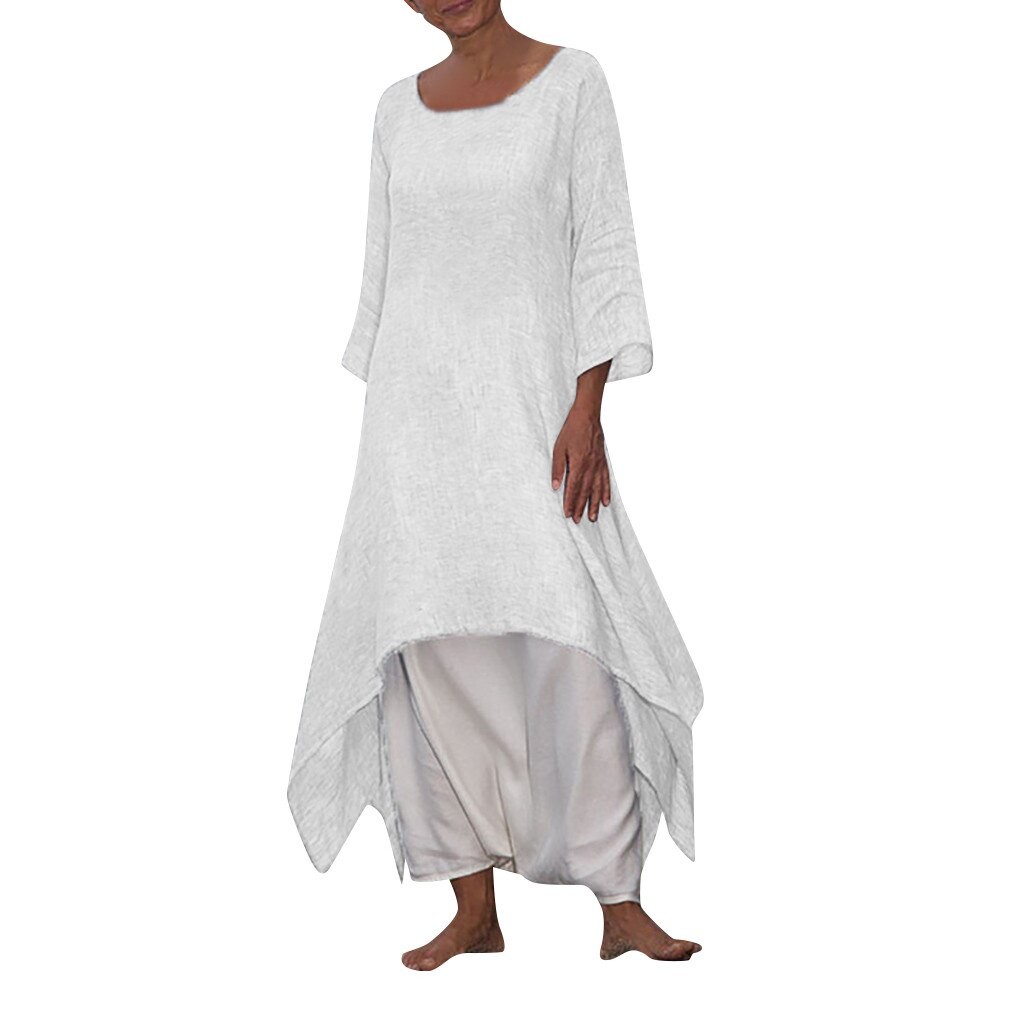 Asymetryczna sukienka maxi z rękawami trzy czwarte.