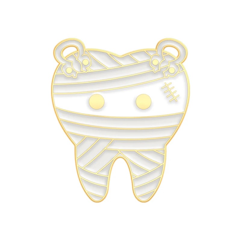 Ta broszka w formie pinu przedstawia motyw zęba stylizowanego na mumie. Powierzchnia zęba jest uzupełniona bandażami, które są równomiernie rozmieszczone po całym kształcie. Prosta twarz z oczami i małym detalem na policzku nadaje motywowi osobisty i zabawny wygląd.
