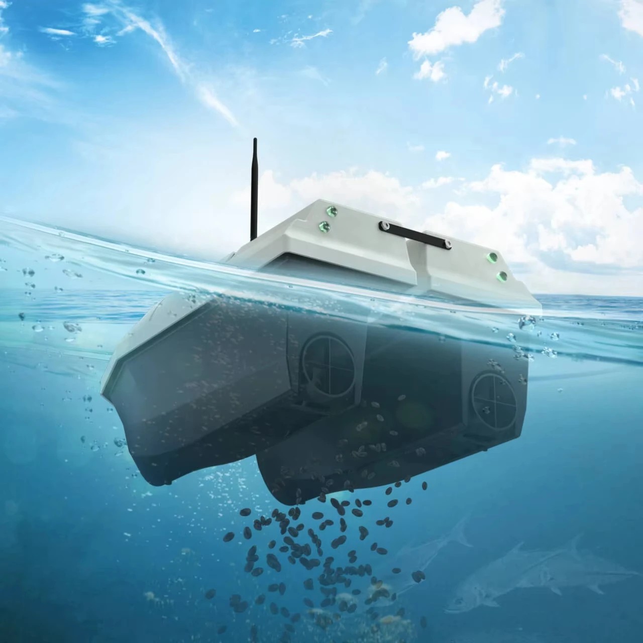 Duża komora nęcąca o nośności do 3,5 kg pozwala na transport różnych rodzajów przynęt, w tym pelletów, ziaren lub mieszanek. Zintegrowane oświetlenie LED zapewnia lepszą orientację podczas wieczornego i nocnego wędkowania. Funkcja stałej prędkości znacznie ułatwia precyzyjne prowadzenie łodzi po wybranej trasie.