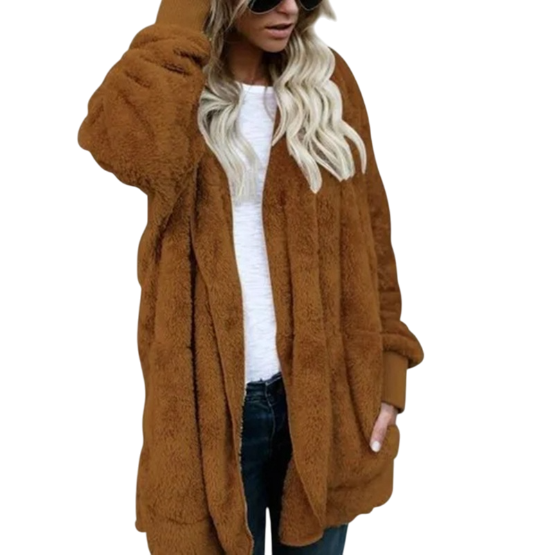 Ta damska ciepła pluszowa kurtka z kapturem jest doskonałym połączeniem komfortu, swobody i stylu na jesień. Wykonana z puszystego i miękkiego polaru, który przyjemnie ogrzewa nawet w chłodniejsze dni, bez uczucia ciężkości. Kurtka ma oversize'owy krój, który świetnie pasuje do różnych typów sylwetki i umożliwia łatwe warstwowanie. Praktyczny kaptur zapewnia ochronę przed wiatrem, podczas gdy luźny kardiganowy styl bez zapięcia nadaje swobodny wygląd. Jest idealna do codziennego noszenia, relaksu w domu lub jako wygodny płaszcz na spacery na świeżym powietrzu.
