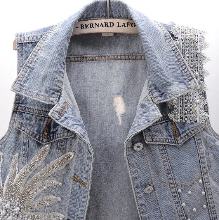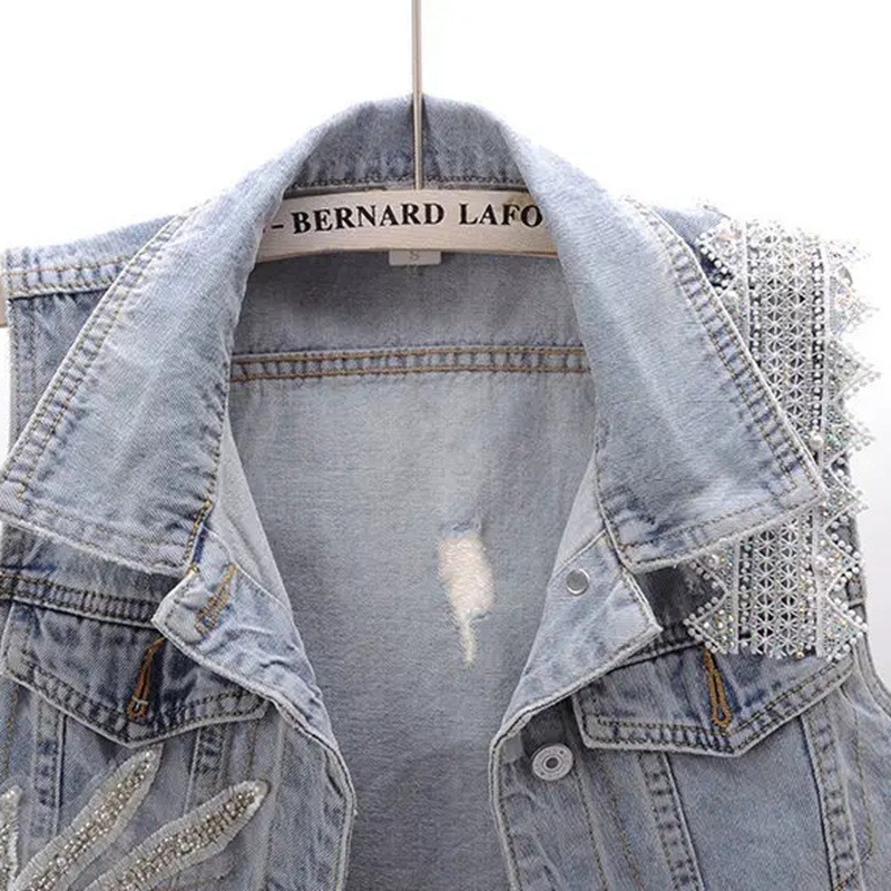 Damska dżinsowa kamizelka z kołnierzykiem i ozdobnymi detalami