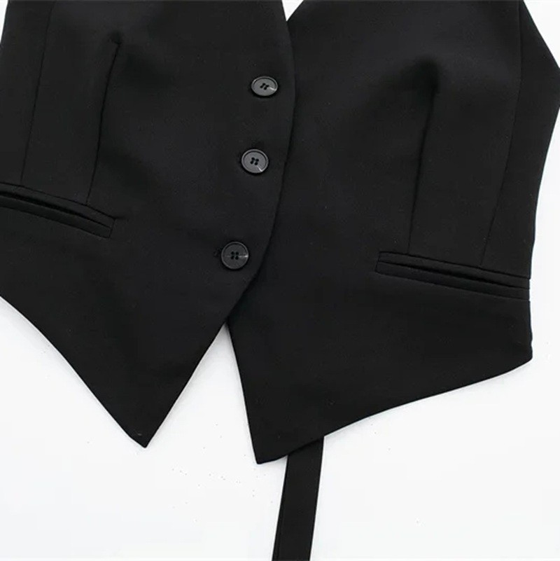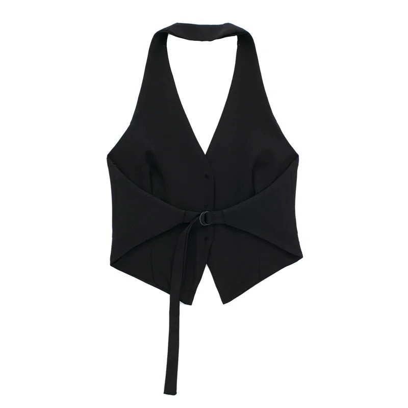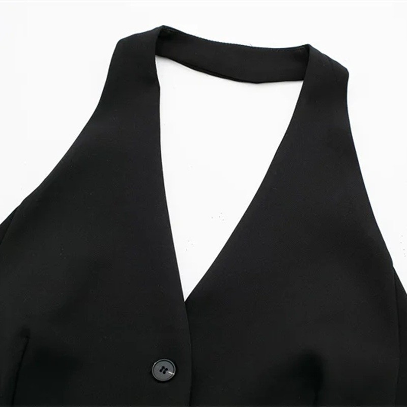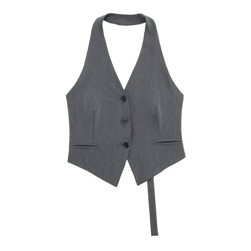 Elegancka damska kamizelka z ramiączkami wokół szyi i wiązaniem z tyłu. Lekki poliester, kieszonki po bokach i zapięcie na guziki dla nowoczesnego stylu. Pełny opis
