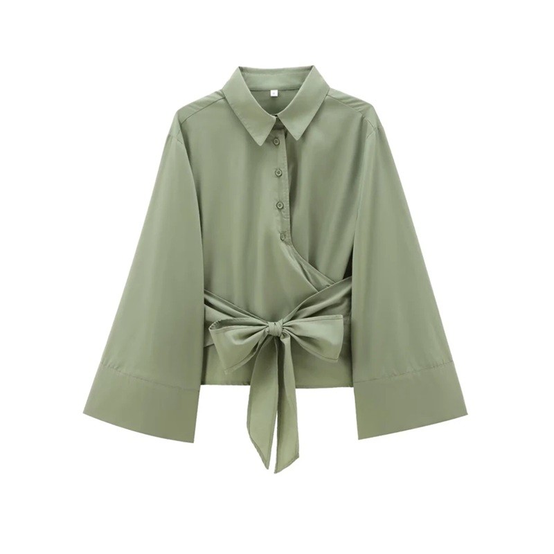 Strona główna Strona główna Odzież i akcesoria Odzież damska Koszule damskie Koszule damskie casualowe Damska elegancka koszula z kołnierzykiem i długim rękawem Stylowe kimono z kokardą w talii Jednokolorowa bluzka na guziki z lekkiego poliestru