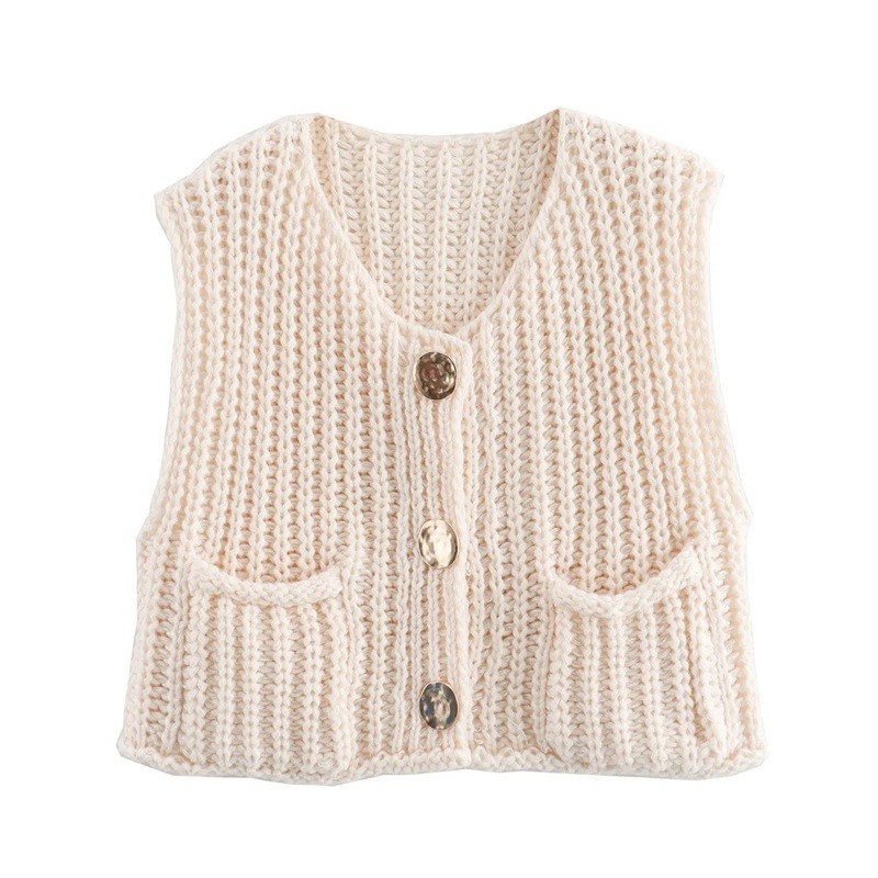 Stylowa damska pleciona kamizelka z dekoltem w kształcie V i kieszeniami. Zapięcie na guziki, miękki materiał poliestrowy i ponadczasowy design na każdą okazję. Pełny opis