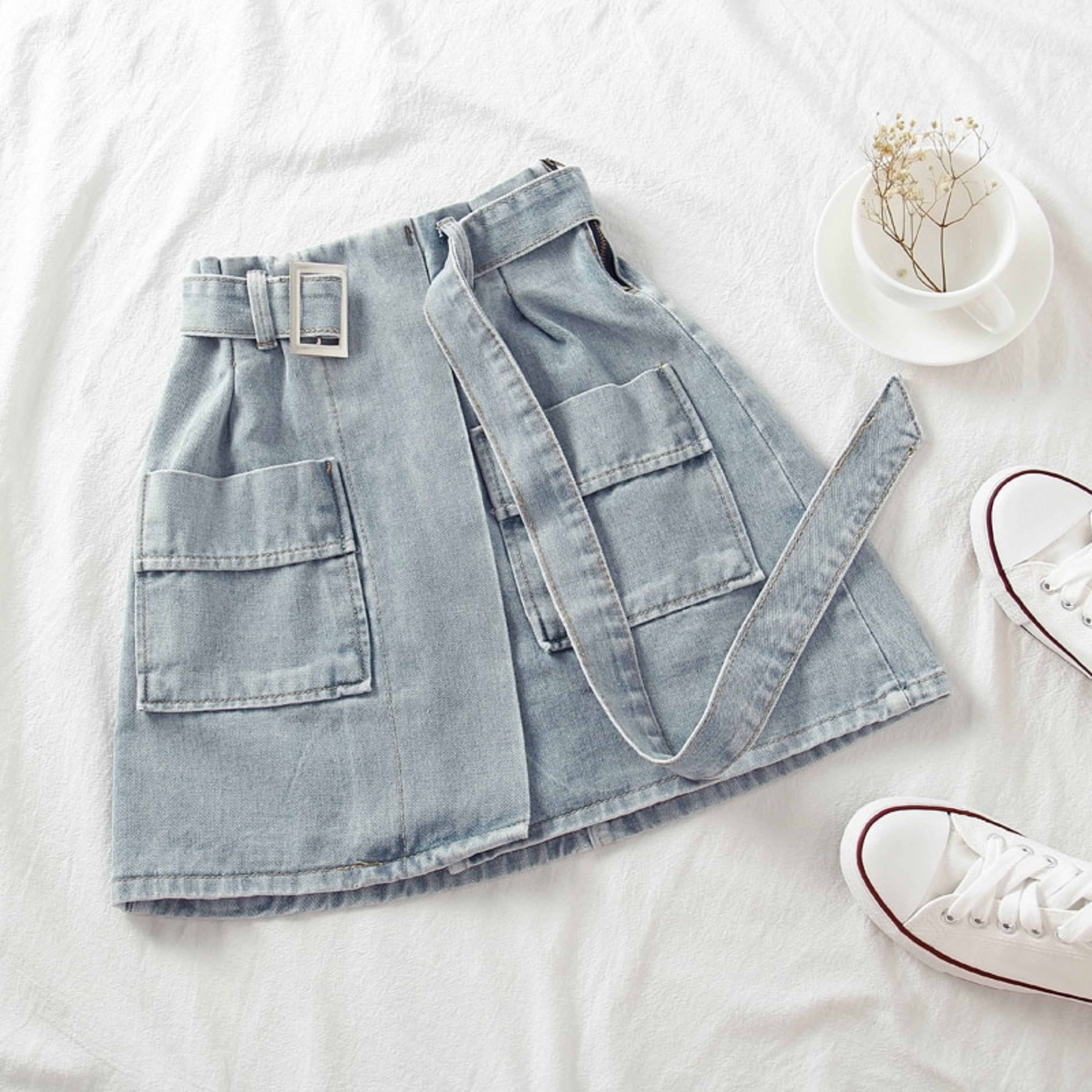 Damska jeansowa mini spódniczka z paskiem