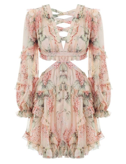 Zwiewna sukienka z długimi rękawami i efektownie zaprojektowanym stanikiem.