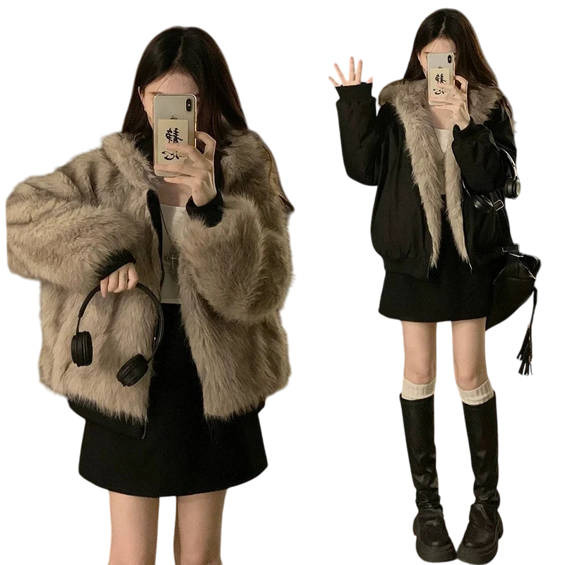 Damska oboustronna zimowa kurtka z kapturem Ciepła kurtka na zamek z futrzaną drugą stroną i kieszeniami Elegancka zimowa kurtka do wygodnego noszenia