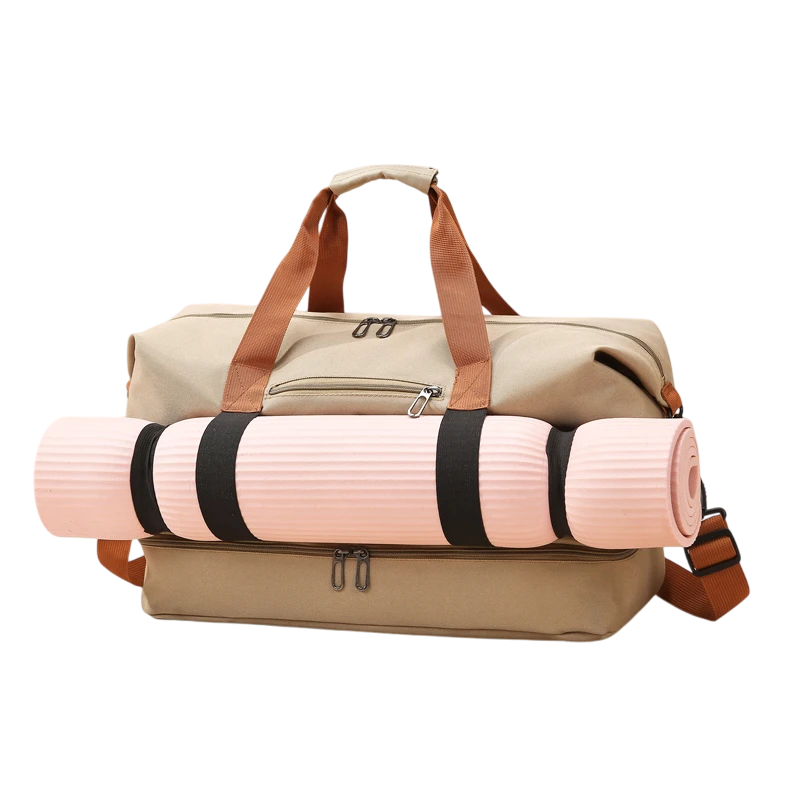 Dużą zaletą jest wodoodporna kieszeń, do której możesz bezpiecznie schować buty, mokrą odzież lub kosmetyki. Do łatwego przenoszenia służą wytrzymałe ucha do ręki i regulowany pasek na ramię, które zapewniają maksymalny komfort noszenia. Torbę można również przymocować do rączki walizki podróżnej, co docenisz szczególnie podczas dłuższych podróży. Praktycznym dodatkiem są także pasy do mocowania maty do jogi, dzięki czemu zawsze masz wszystko, co potrzebne, pod ręką.