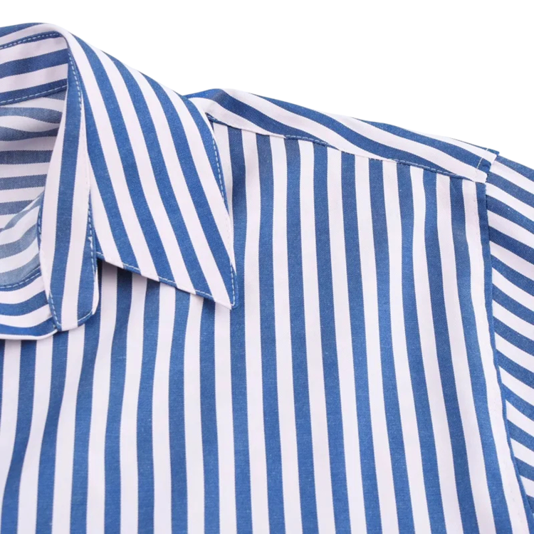 Elegancka prążkowana damska koszula z kołnierzykiem i luźnym krojem z lekkiego poliestru. Idealna do pracy, na co dzień i na wydarzenia towarzyskie. Pełny opis