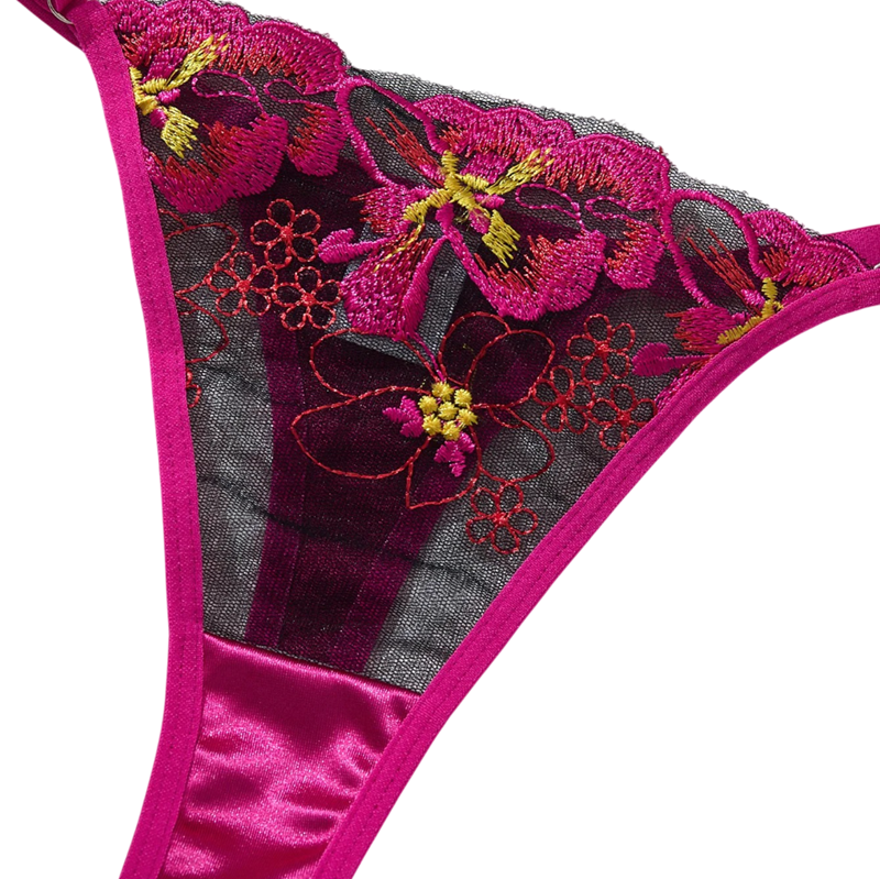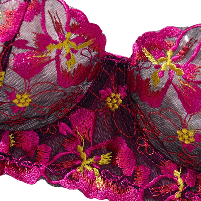 Różowa damska souprawa z koronką i kwiatowym haftem. Biustonosz i majtki z poliestru i elastanu odpowiednie do wygodnego noszenia. Pełny opis