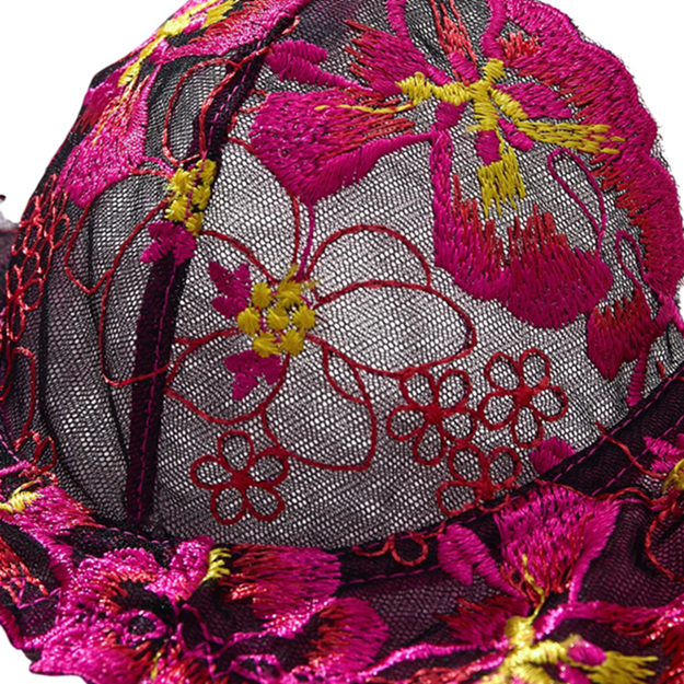 Damska spodnia souprawa składa się z biustonosza i majtek, które przyciągają uwagę wyrazistą koronką i szczegółowym kwiatowym haftem. Kombinacja różowego odcienia z delikatnymi wzorami tworzy interesujący wizualny kontrast. Skład materiałowy zapewnia elastyczność i dopasowanie podczas codziennego noszenia. Souprawa została zaprojektowana tak, aby była odpowiednia do codziennego użytku i jednocześnie wyglądała estetycznie. Dzięki lekkiej konstrukcji jest łatwa do noszenia i dopasowuje się do ruchów.