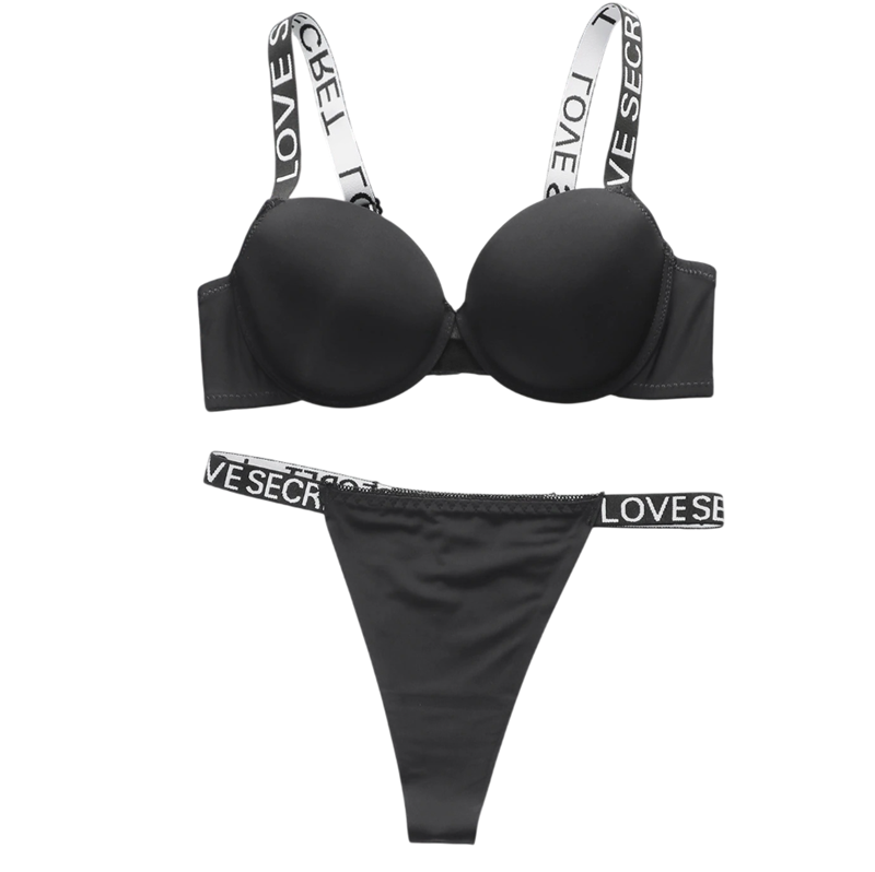 Damska souprawa z biustonoszem i majtkami z elastycznymi paskami z napisami. Materiał poliamid i elastan odpowiedni do wygodnego noszenia. Pełny opis