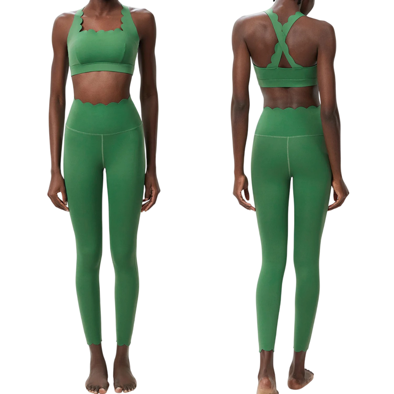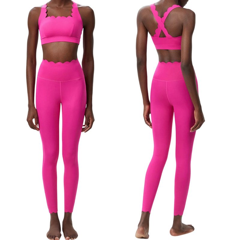 Damska sportowa souprawa z legginsami i sportowym biustonoszem z nylonu i spandexu. Idealna do fitnessu, ćwiczeń lub na co dzień, wygodny, elastyczny i nowoczesny materiał. Pełny opis
