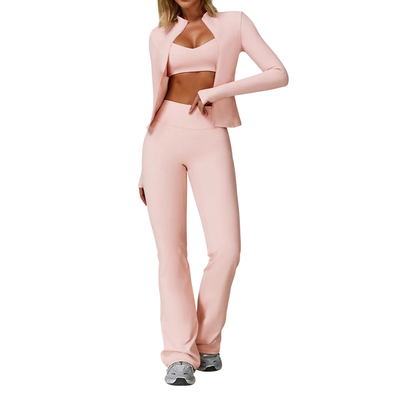 Damska sportowa souprawa z spodniami, bluzą na zamek i sportowym biustonoszem z nylonu i spandexu. Prosty design, idealna do fitnessu, ćwiczeń lub czasu wolnego, wygodny i elastyczny materiał. Pełny opis