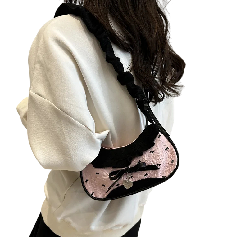 Torba oferuje wystarczająco dużo miejsca na przechowywanie podstawowych rzeczy osobistych, takich jak portfel, telefon komórkowy, klucze czy drobna kosmetyka. Dzięki swojej lekkiej konstrukcji nosi się ją wygodnie i nie obciąża nawet przy dłuższym użytkowaniu. Czarno-różowe wykończenie nadaje torbie wyrazisty, ale wciąż gustowny wygląd. Wzór kokardek podkreśla kobiecy charakter i odróżnia torbę od zwykłych jednokolorowych modeli. Torba jest odpowiednia dla kobiet, które szukają połączenia praktyczności i osobistego stylu.