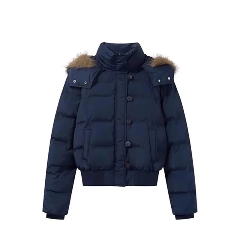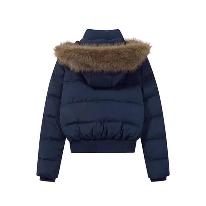 Ciepła bawełniana zimowa kurtka z kapturem z futerkiem, wysokim kołnierzem, podwójnym zapięciem i kieszeniami zapewnia komfort i ochronę w chłodnych warunkach. Pełny opis