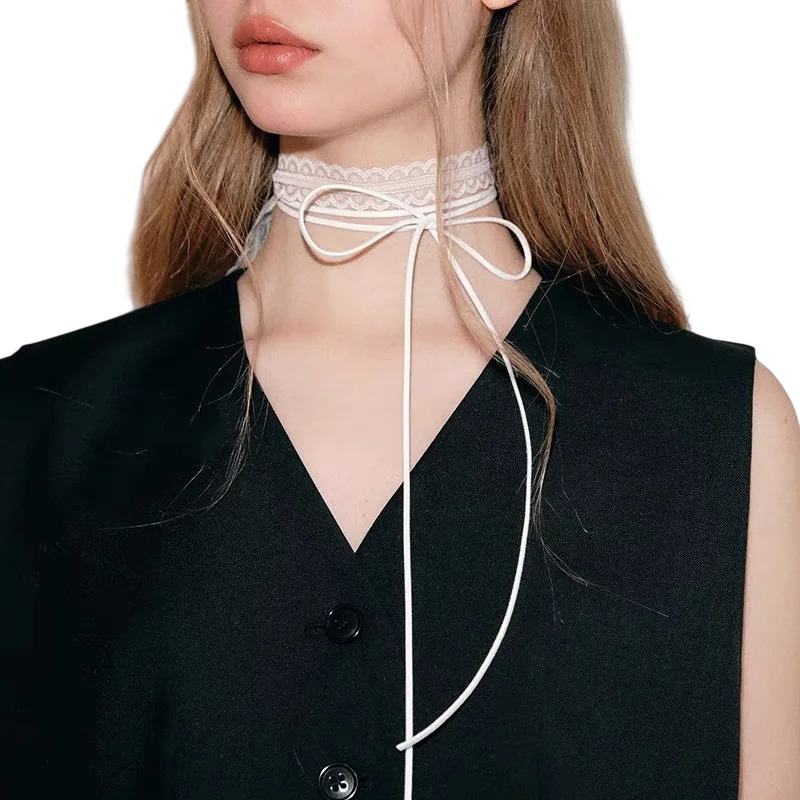 Stylowy damski choker z koronką w białym kolorze, wiązany design odpowiedni na uroczystości i codzienne stylizacje. Pełny opis