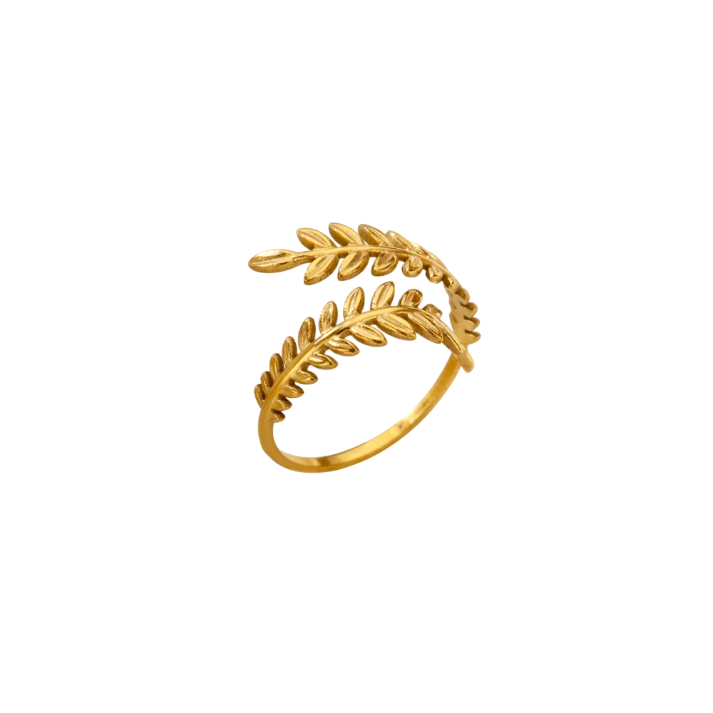 Dekoracyjny pierścionek z delikatnym motywem gałązki i liści z trwałej nierdzewnej stali w złotym wykończeniu. Otwarty design umożliwia łatwe dopasowanie do palca. Pełny opis
