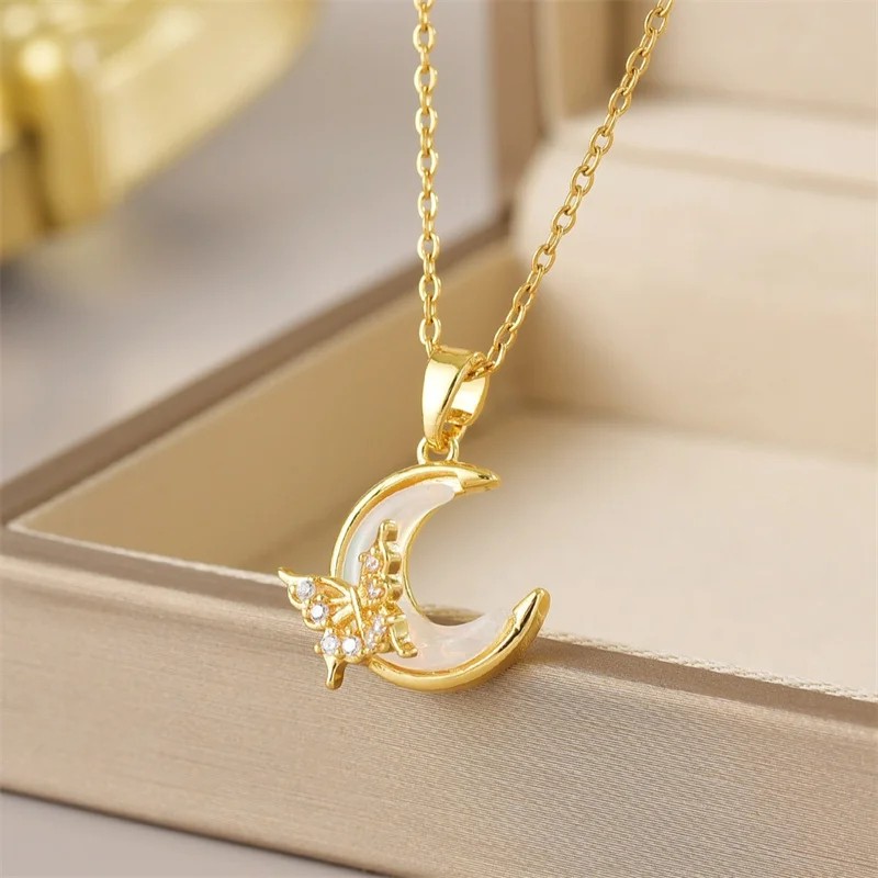 Damski złoty choker z zawieszką w kształcie księżyca i motylka z chirurgicznej stali nierdzewnej z cyrkoniami
