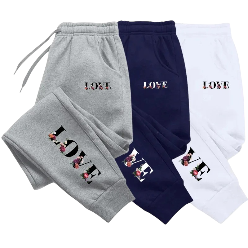 Damskie spodnie dresowe z napisem LOVE na boku i nogawkach na sznurku Polyester Jednobarwne Wygodne i stylowe na codzienne noszenie Damskie spodnie dresowe z napisem
