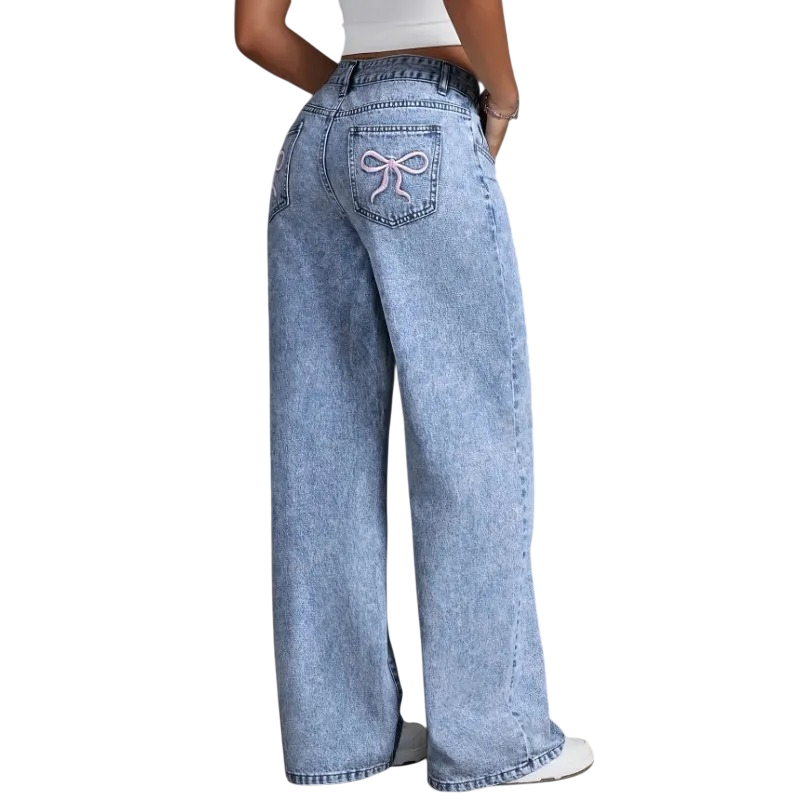 Damskie dżinsy niebieski kolor Kokardki na tylnych kieszeniach Luźny krój Kieszenie Bawełna Poliester Spandex Nowoczesne casualowe spodnie