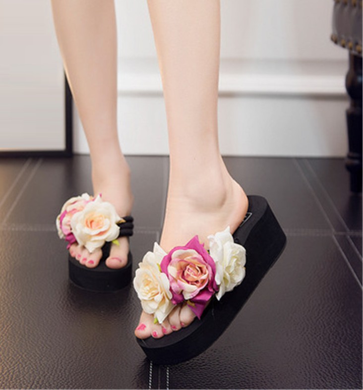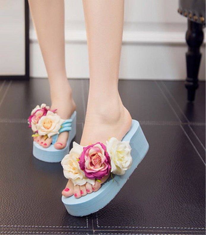 Damskie japonki na platformie z kwiatami
