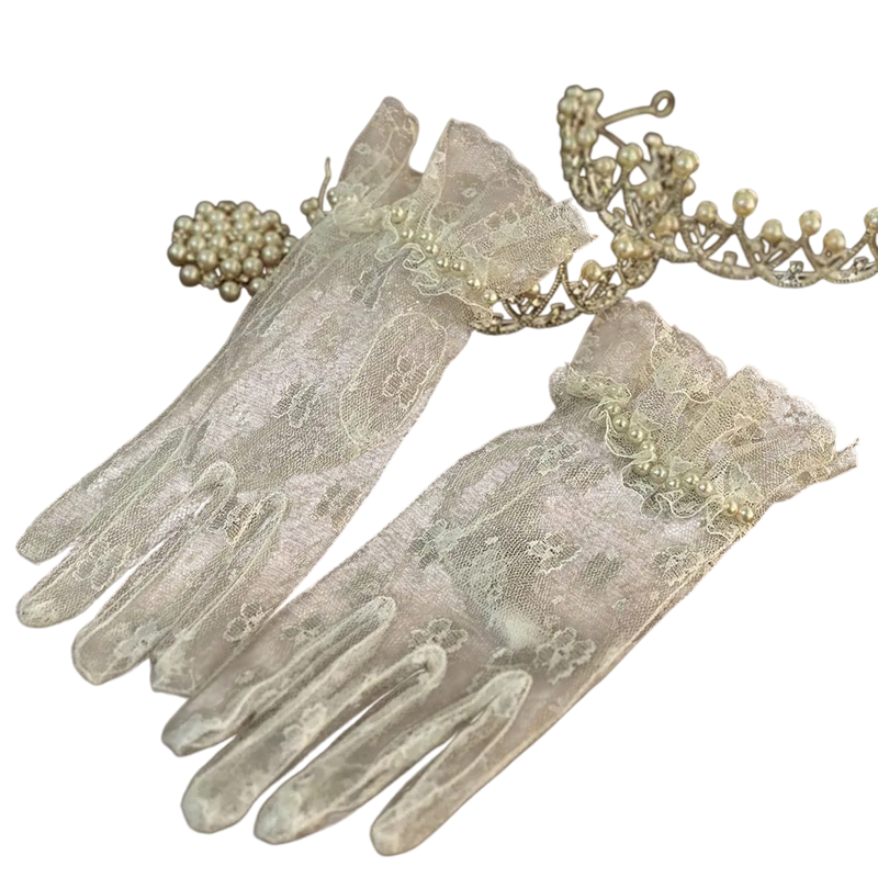 Damskie koronkowe rękawice całopalczaste z perłami krótkie z marszczeniem oddychający poliester białe rękawice na wieczorowy i uroczyste okazje