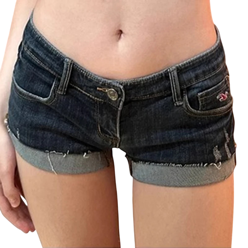 Damskie krótkie niebieskie dżinsowe szorty z niskim stanem i elastyczną dopasowaną szorty. Letnie obcisłe dżinsowe szorty do noszenia na co dzień i na czas wolny.