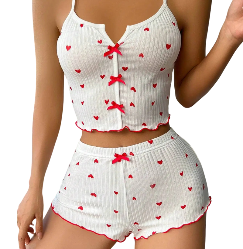 Strona główna Strona główna Odzież i akcesoria Odzież damska Bielizna nocna damska Piżamy damskie Damskie piżamo w wzór serduszek Jednokolorowy zestaw z kokardkami Top z dekoltem w kształcie V i szorty Wygodny zestaw z poliestru i spandexu