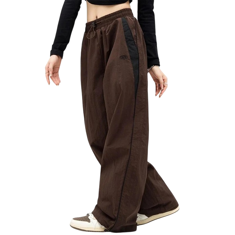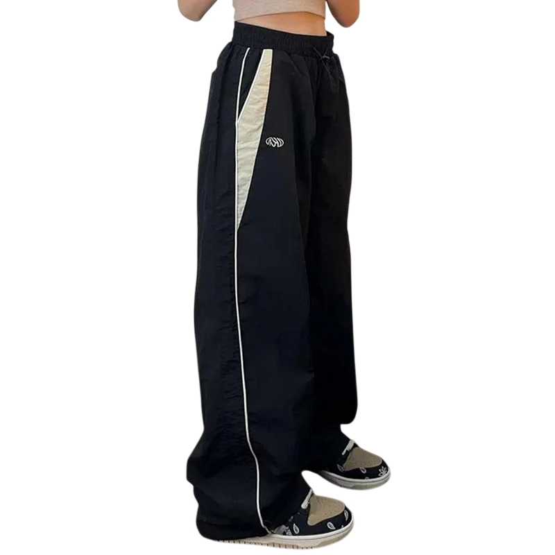 Damskie spodnie dresowe z kontrastowymi paskami i elastycznym pasem na sznurku, wykonane z materiału poliester, idealne do sportu, czasu wolnego i codziennego noszenia. Pełny opis