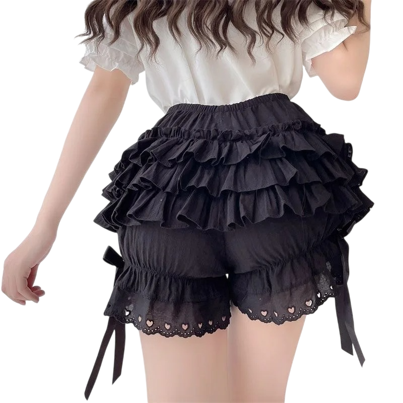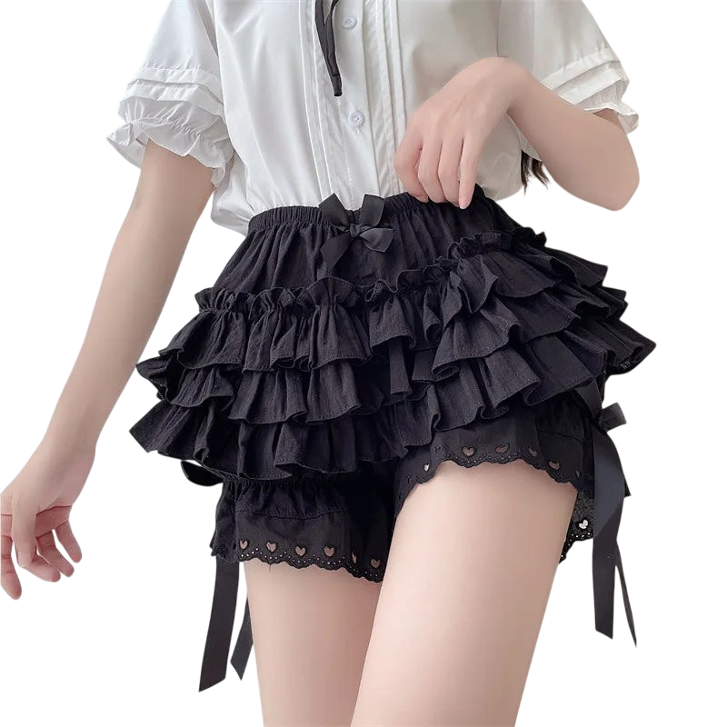 Romantyczne szorty z wysokim pasem, koronką, marszczeniem i kokardkami z szyfonu, idealne na lato, czas wolny i specjalne okazje. Pełny opis
