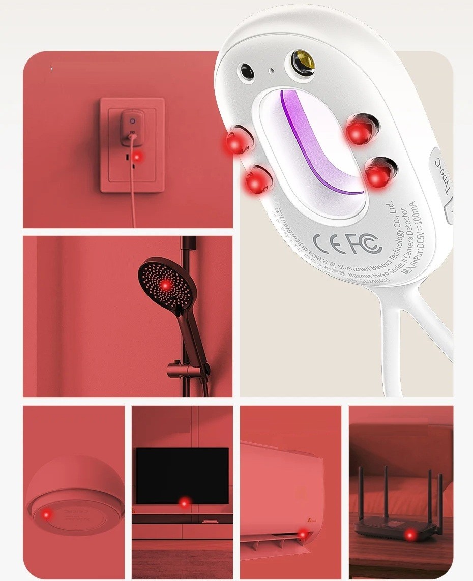Detektor ukrytych kamer 85 x 58 x 5 mm 28 g Baseus Heyo Series II BS-HP024 IR LED do 5 m 3 tryby Alarm wibracyjny USB-C