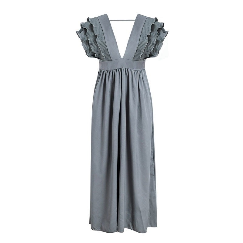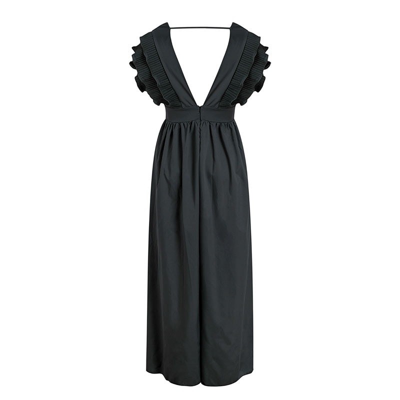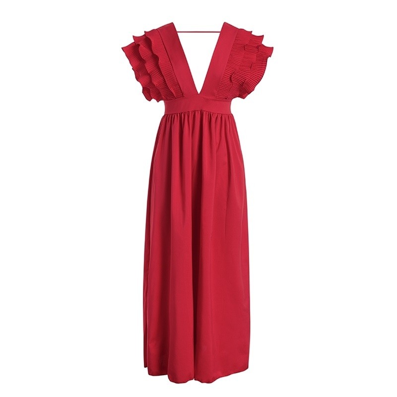 Długa sukienka damska bez rękawów ozdobiona marszczeniami. Głęboki dekolt i wygodny materiał.