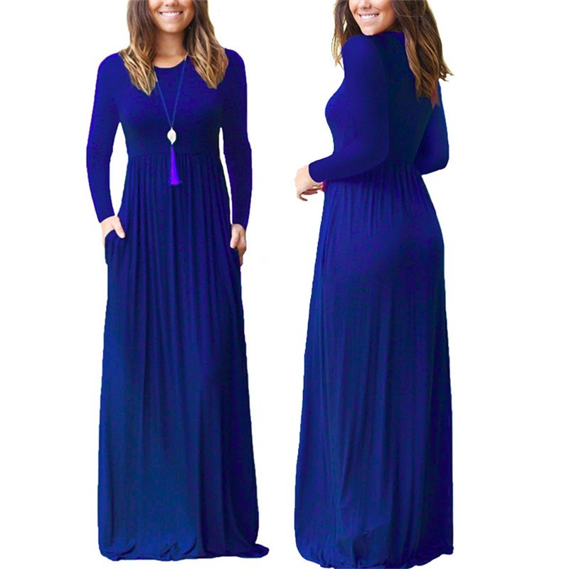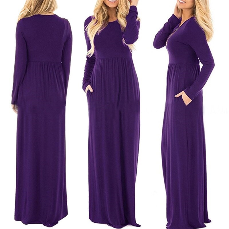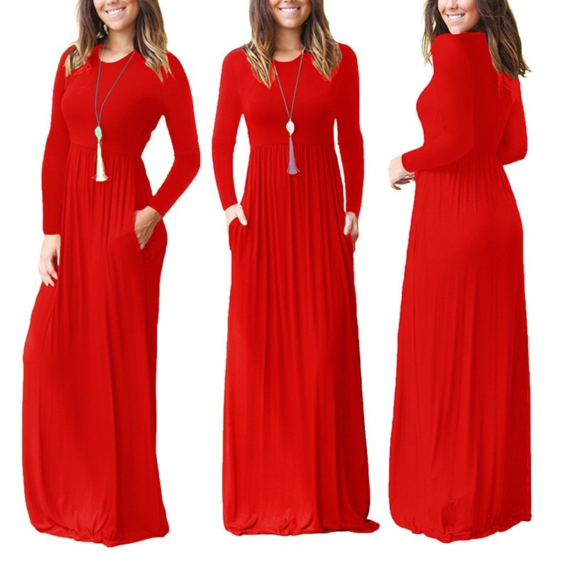 Długa szeroka spódnica i klasyczny okrągły dekolt.