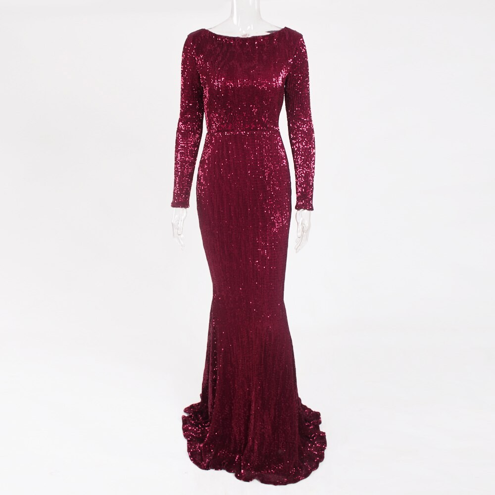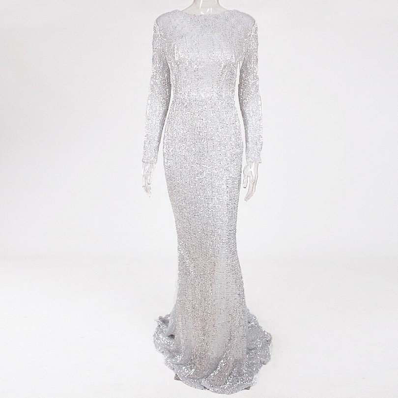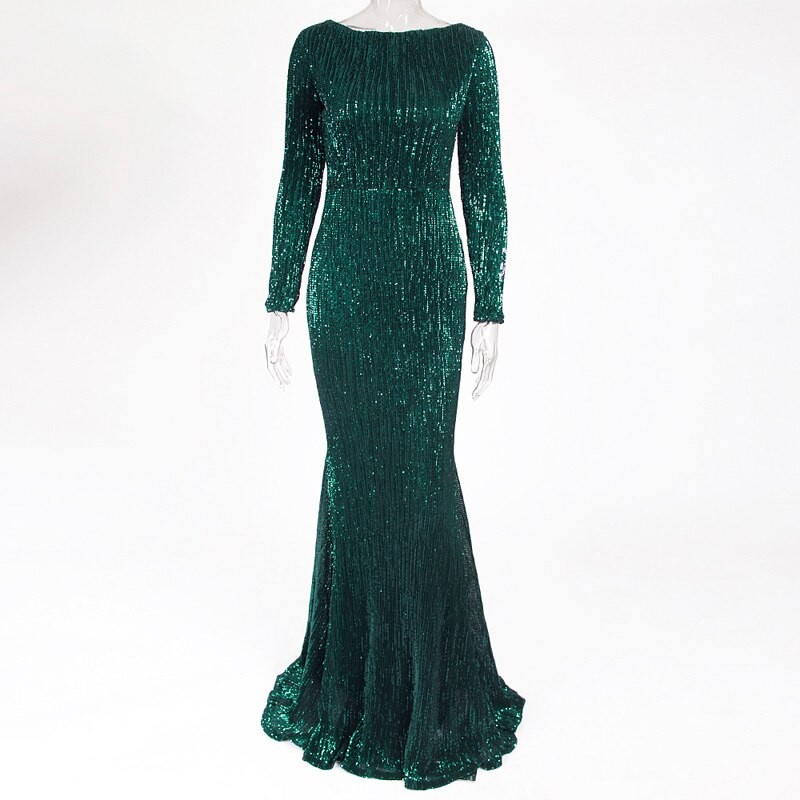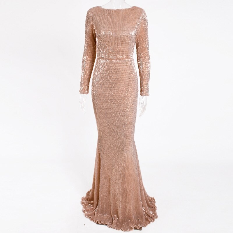 Luksusowa długa cekinowa sukienka z długim rękawem.