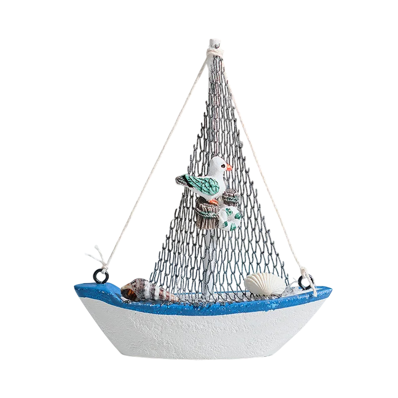 Wyrazistym elementem jest dekoracyjna siatka, która jest przymocowana między konstrukcyjnymi częściami łódki i wzbogacona o drobne detale. Częścią dekoracji jest także figurka ptaka, która nadaje produktowi specyficzny wygląd i wspiera morski motyw. Te elementy zwiększają wizualne zainteresowanie i uzupełniają ogólny design.