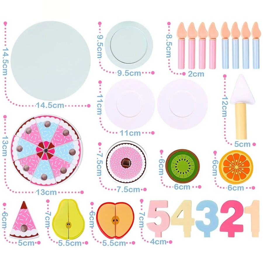 Dziecięcy dwupiętrowy tort urodzinowy to piękna i zabawna zabawka dla małych miłośników przyjęć i zabawy w kucharza. Ten realistycznie wykonany tort pozwala dzieciom przygotowywać własne urodzinowe przyjęcia i rozwijać ich wyobraźnię. Tort jest podzielony na poszczególne kawałki, które dzieci mogą kroić i ponownie łączyć, co pozwala im ćwiczyć motorykę małą. Sam tort ma wielkość 13 cm, co jest idealnym rozmiarem do wygodnej zabawy dla dzieci. W zestawie znajduje się również owoce, świeczki, ozdoby i łyżka, które tworzą realistyczne doświadczenie zabawy.