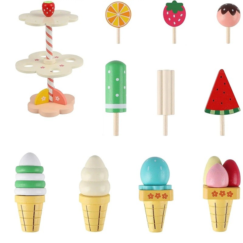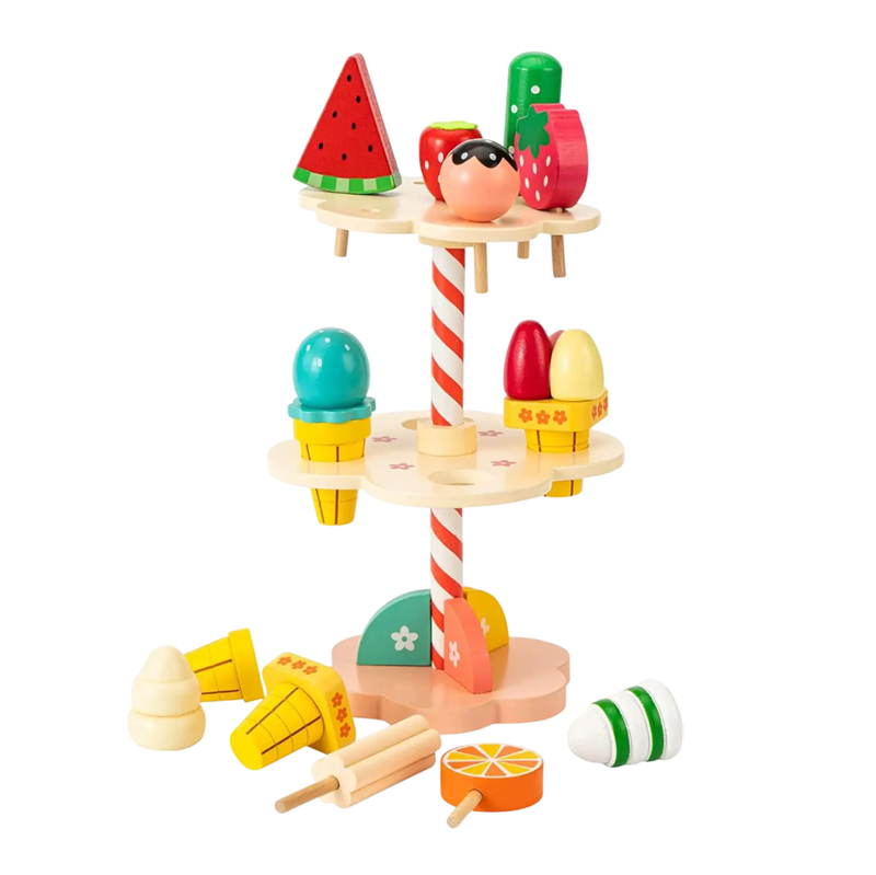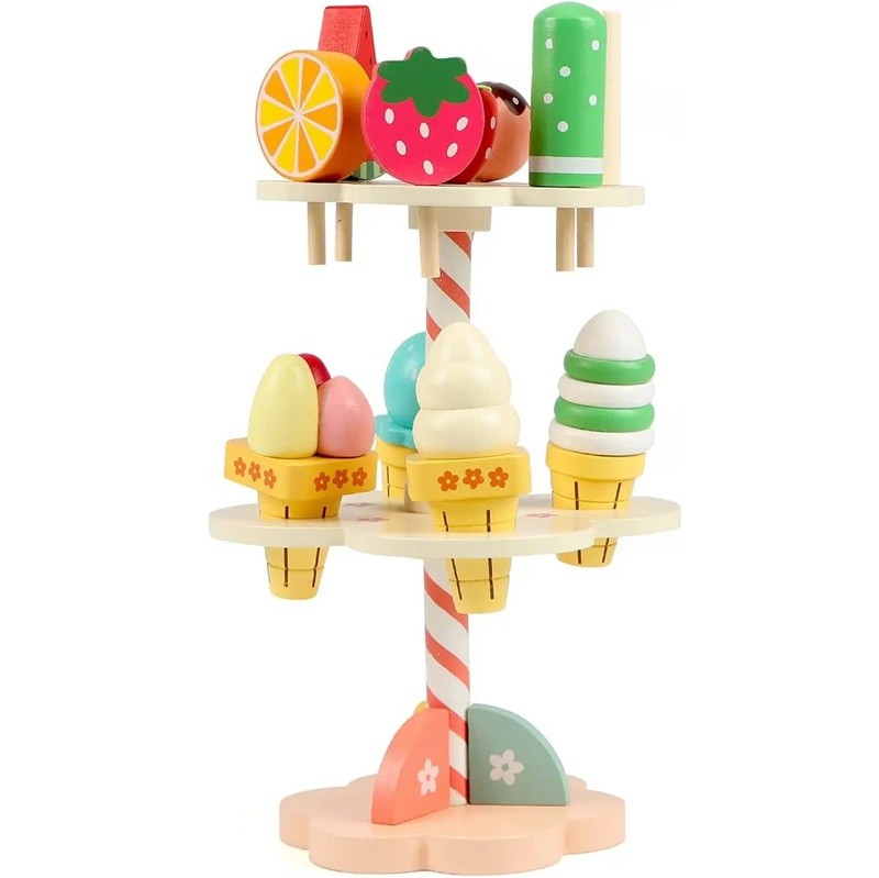 Drewniany trzypoziomowy blat z lodami Montessori zabawka dla dzieci Stojak na lody i owoce Akcesorium kuchenne do zabawy dla małych dzieci różne rodzaje